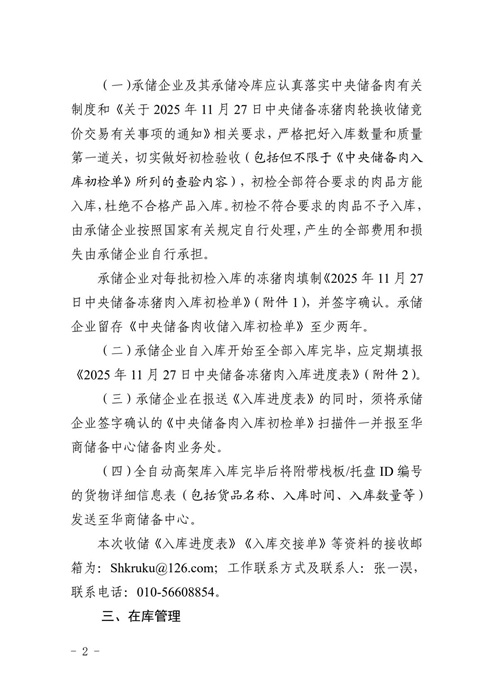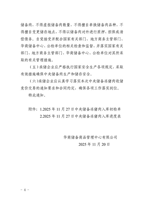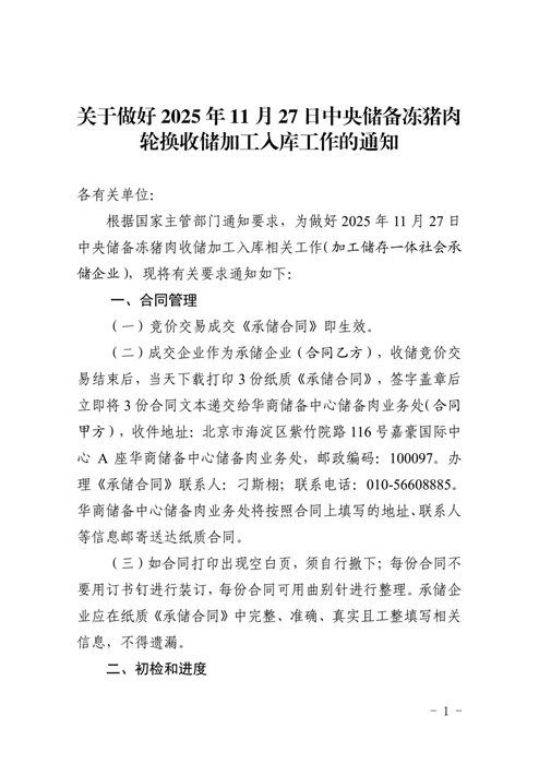 關于做好2025年11月27日中央儲備豬肉輪換收儲加工入庫工作的通知